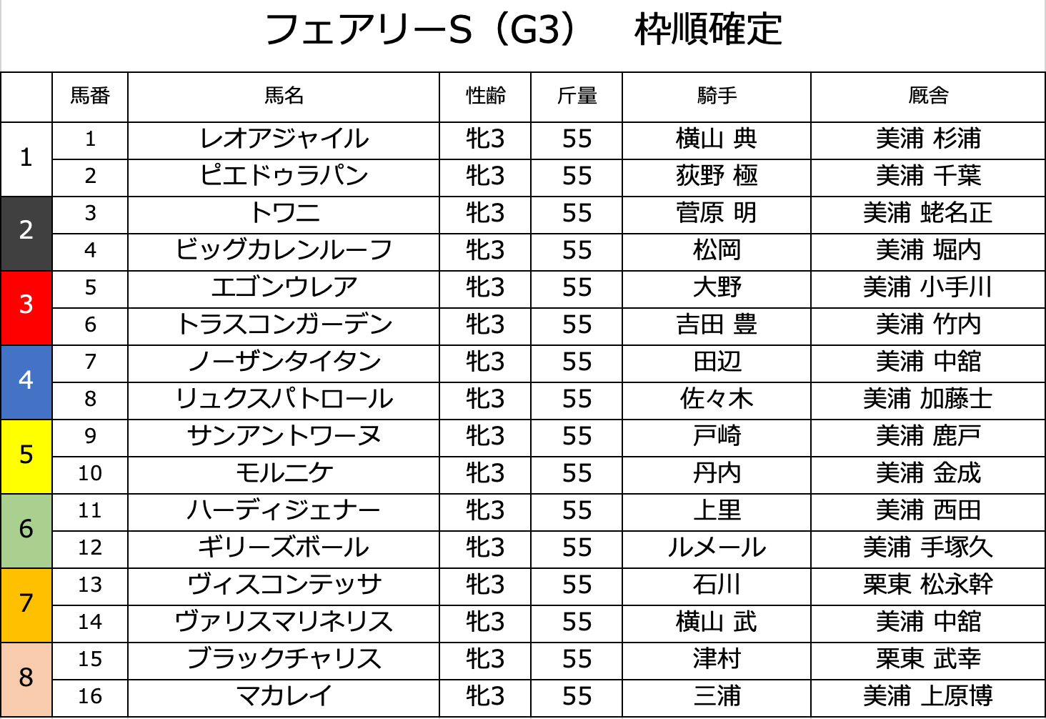 フェアリーS 2026【枠順確定】