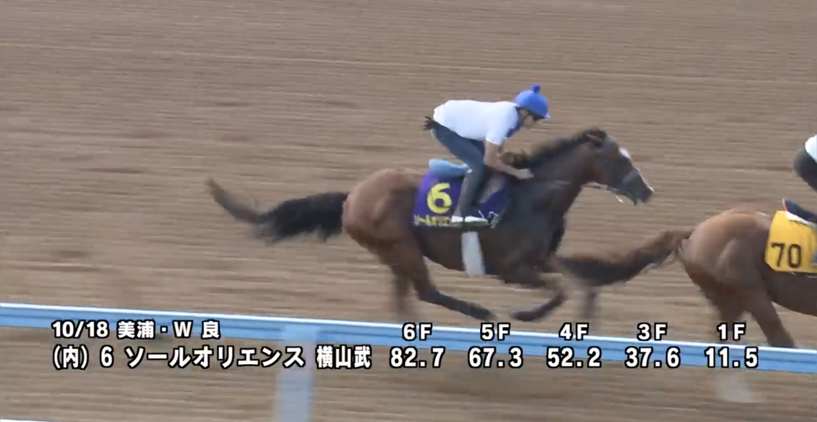 2週連続 横山武史騎手が調整。先週同様 後ろから前を捕える調教内容で今回は僚馬を1.6秒追走して キッチリ0.1秒先着 。ゴール前仕掛けられると鋭く反応し しまい11.5秒をマーク。可動域が広く回転の速い脚捌きで柔らかいフォームが好感持てる。馬体もすっきりとしており 折り合いも良く万全の仕上がりで2冠可能な出来!