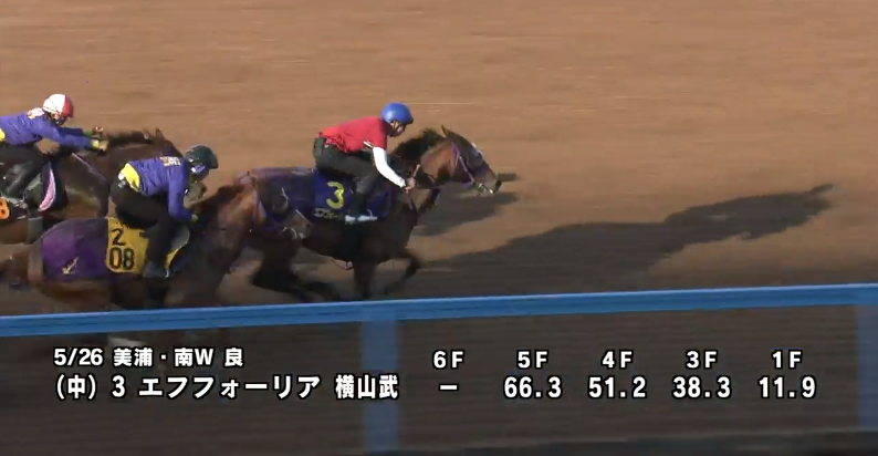 馬なりの僚馬を0.4秒追走し0.2秒先着。